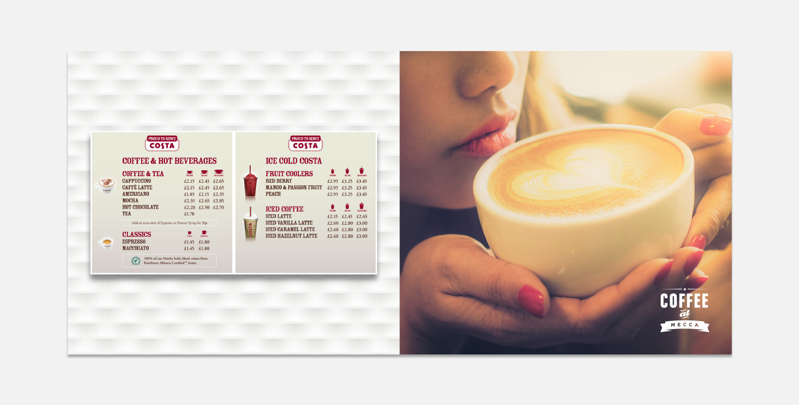 As part of a move to appeal to a wider audience, Mecca Bingo were looking at opening coffee lounges in the foyer area of their bingo halls. I was asked to produce a number of design options to explore how this could look and feel.